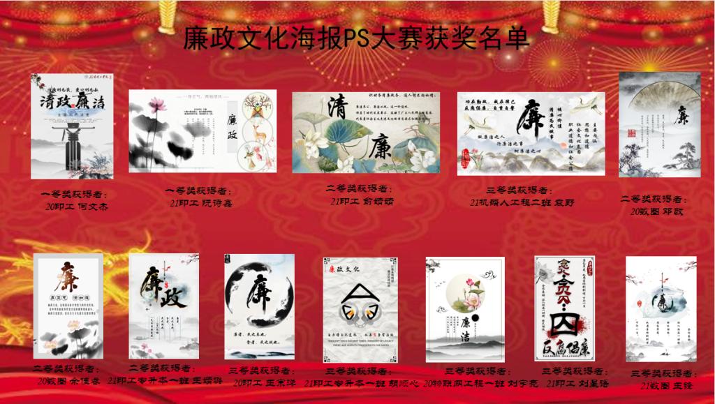 经过评选, 20数图班、21印工班、21数图2班在进班级廉政文化中获优秀班集体;阮诗鑫、何文杰在PS海报设计大赛中获一等奖,邓敬、余佳睿、王婧璐、俞婧婧获二等奖,袁野、刘星语、刘宇亮、胡顺心、王宗洋、王锋获三等奖:刘静、詹思奕在进宿舍手绘作品征集活动中获一等奖,胡婷婷、吴慧洁、晏昕、孟祥秀(罗丹丹、唐慧)获二等奖,刘玢洋(段琴慧)、丁香月、卢新晴、李丁灿、倪婷婷、赵胜男获三等奖。