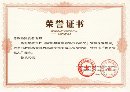 2024年11月15日,第15届中国印刷与包装学术年会暨产学研协同创新论坛在渤海之滨天津拉开帷幕,并于当日晚间举办颁奖典礼。在典礼上,为表彰优秀审稿专家对《印刷与数字媒体技术研究》期刊建设作出的卓越贡献,根据审稿专家在数量、质量、响应及时程度等方面的情况,共评选出优秀审稿人12名。我院陈良哲副教授榜上有名,获此殊荣。