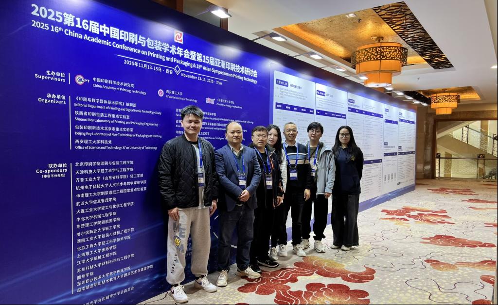 近日,第16届中国印刷与包装学术年会暨第15届亚洲印刷技术研讨会(2025年11月13日至15日)在西安隆重举行。太阳网集团tyc8722作为会议联办单位之一,由太阳集团官网8722黄少云、陈良哲、王红、罗意、罗文奇、王君六位博士青年教师和硕士研究生涂倩组成的代表团受邀参会。